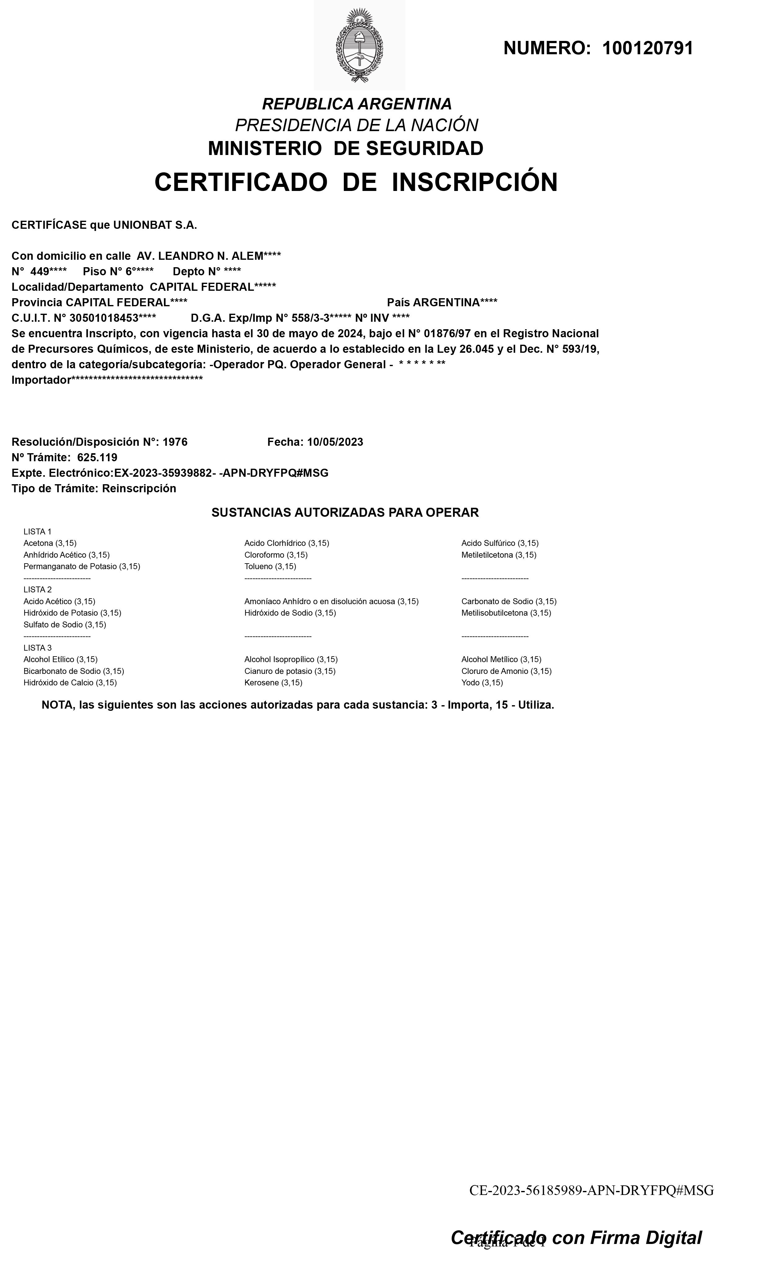 CERTIFICADO DE PRECURSORES QUÍMICOS - RENPRE - MINISTERIO DE SEGURIDAD
